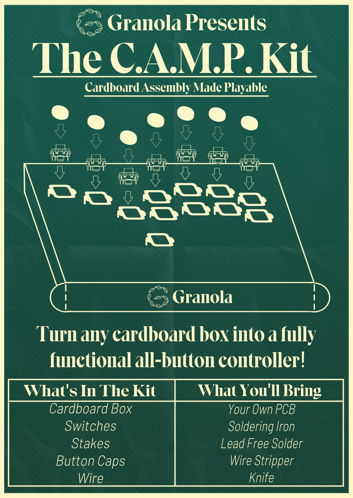 C.A.M.P. stands for Cardboard Assembly Made Playable. If you add a C.A.M.P Kit to your Granola controller order, you can re-use the box that your controller arrived in to create a fully functional second controller to use or gift! C.A.M.P. kits make an excellent hobby project, and if you've never built an arcade controller before this is a great way to dive in.