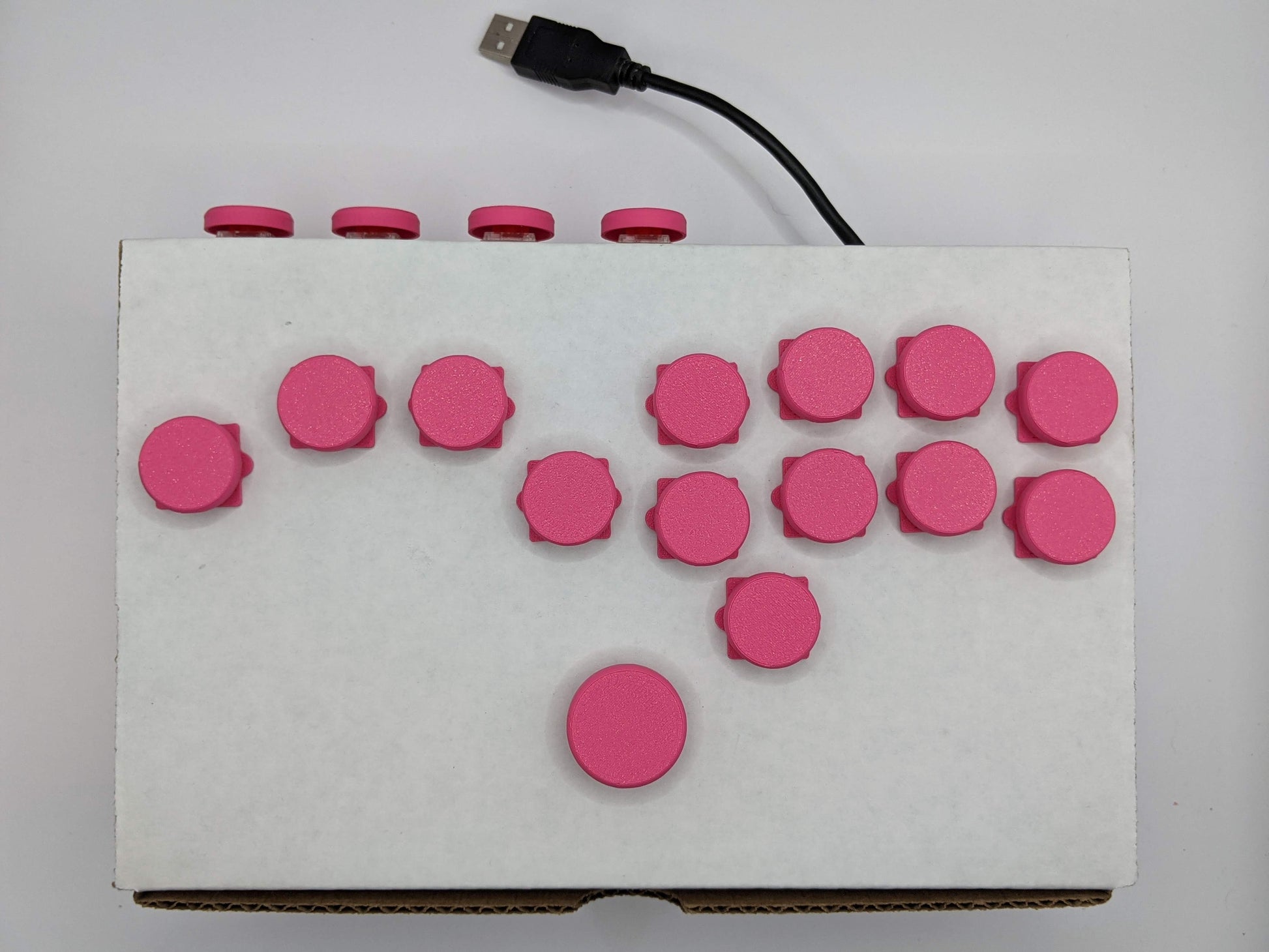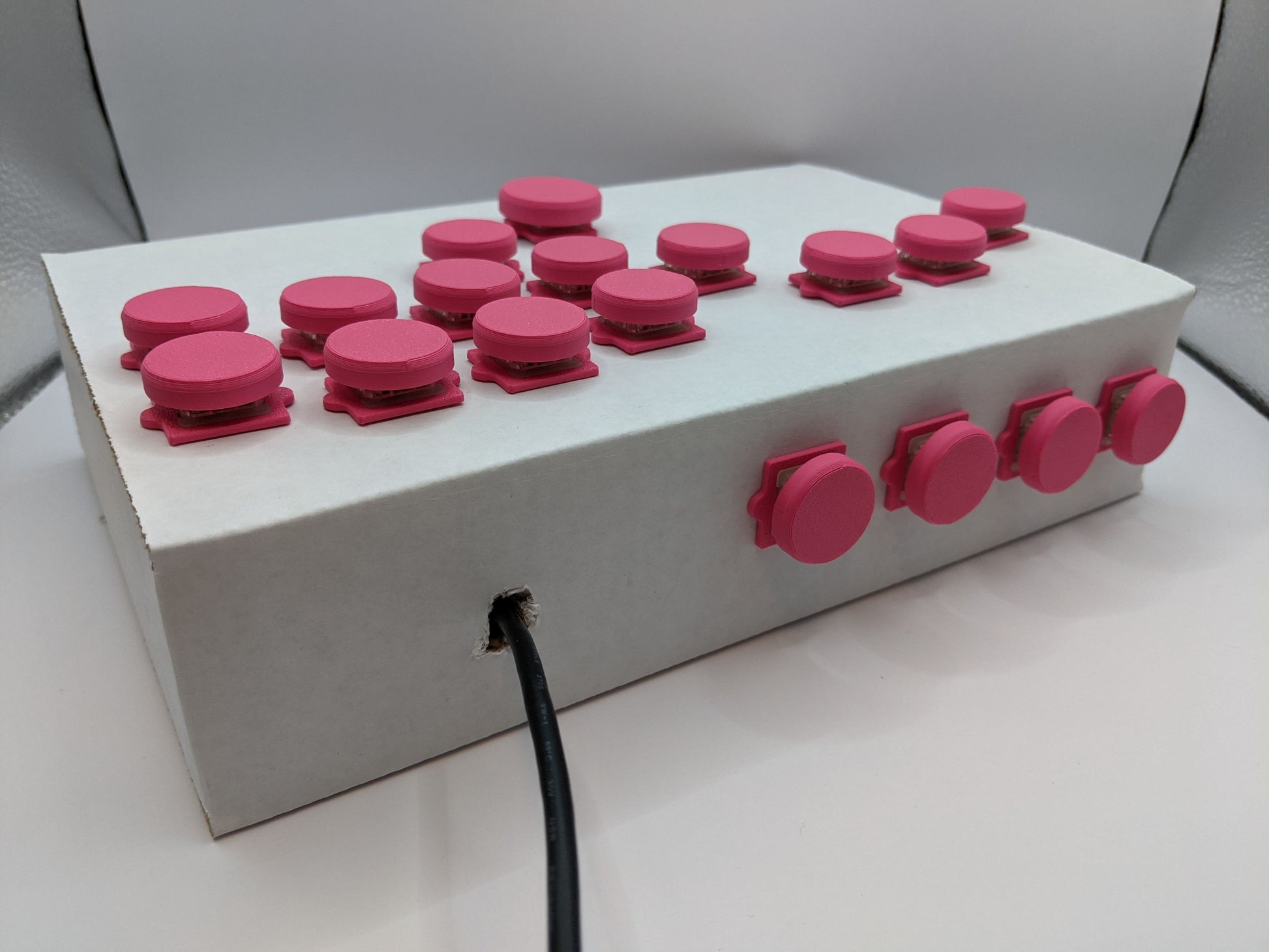 - 20x switch stakes: These are designed to be inserted into the cardboard box. They give you a template to cut holes, and also a stable base for the switches. Like the switches, you will use 18 to build the controller, and the other two are for you to accidentally step on and break.